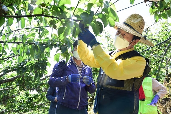 21일에는 조규일 시장을 비롯한 농업기술센터 직원 50여 명이 문산읍 옥산리 배 재배 농장을 찾아 배 봉지 씌우기 등 일손 돕기에 구슬땀을 흘렸다.