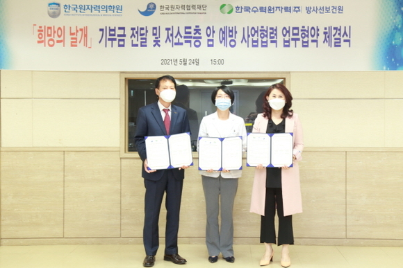 한국수력원자력(이하 한수원) 방사선보건원이 24일 한국원자력의학원에서 한국원자력의학원, 한국원자력협력재단과 ‘저소득층 암 예방 및 퇴치를 위한 업무협력 양해각서’를 체결하고 이들 기관에 총 1800만원의 기부금을 전달했다.