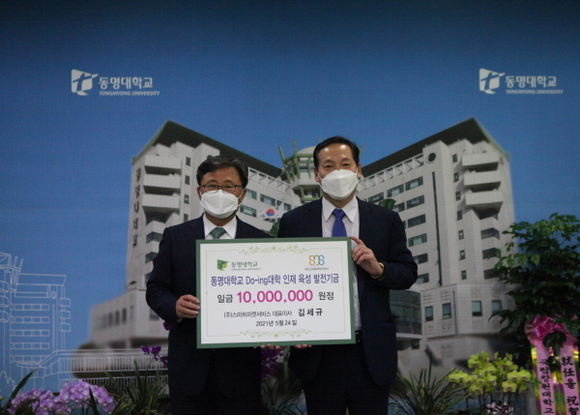 (왼쪽부터) 전호환 총장과 김세규 대표가 발전기금 전달식에서 기념촬영을 하고 있다. (사진=동명대 제공)