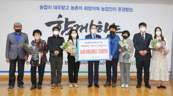 이날 경남 관내 농업인 중 올해로 결혼 60주년을 맞이한 부부, 3대가 함께 거주하는 농업인, 다자녀 가정 농업인, 청년농업인 부부 등 네 쌍의 부부를 선정해 감사의 뜻을 전했다.