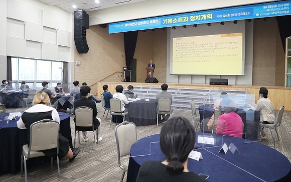 이번 특강은 한신대 경제학과 강남훈 교수를 초청해 농민회, 한국노총, 돌봄센터, 양산YMCA, 학부모연합회, 여성단체 및 예술단체 등 사회 다양한 분야의 약 35개 단체 100여명이 참여한 가운데 진행됐다.