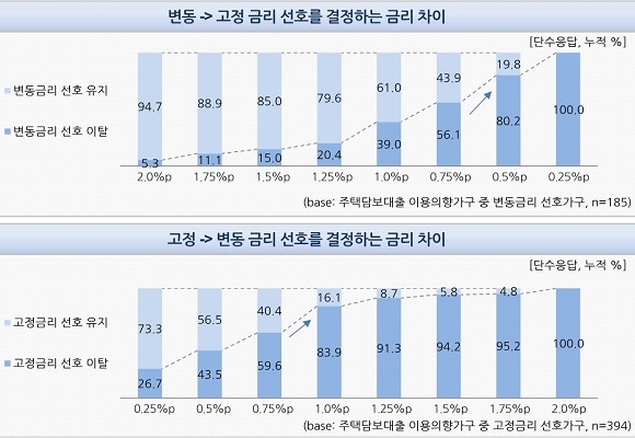주택담보대출 이용 의향 가구 가운데 변동금리 선호 가구는 고정금리와의 금리 차이가 0.75%p 이내로 좁혀질 때 고정금리를 선호하는 비율이 높아지는 모습을 보였다. 고정금리 선호가구도 변동금리와 금리 차이가 0.75%p 이상 확대될 때 변동금리를 선호하는 비율이 높아지는 것으로 조사됐다.