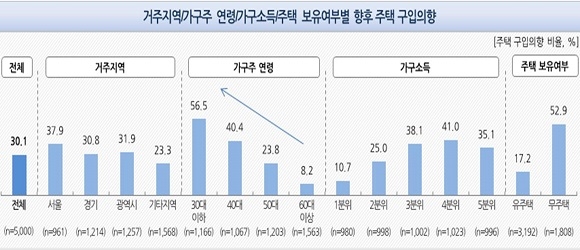 일반가구 중 38.7%가 주택금융상품을 이용 중이며 지역별로는 서울(53.8%)과 경기(51.3%)가 평균 대비 높은 이용률을 보였다. 특히 가구소득이 높을수록 주택금융 상품 이용률이 높게 나타났으며 가구주 연령별로는 40대가 54.2%로 가장 높은 이용률을 기록했다.