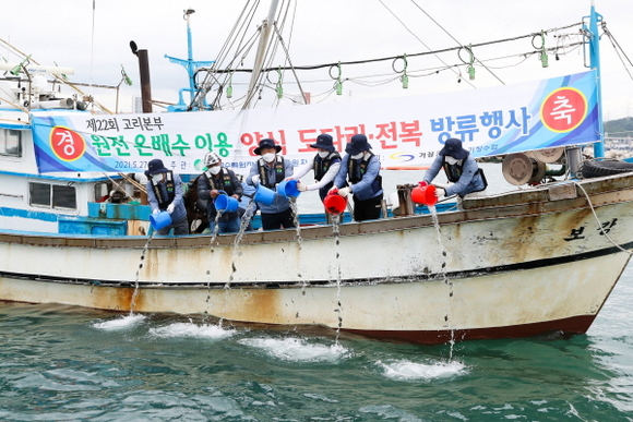 행사 참석자들은 선박에 승선해 월성원전 온배수 양식장에서 기른 강도다리 치어 3만미와 전복치패 2만미 등 총 5만미의 어패류를 월내항 주변 해역에 직접 방류했다.