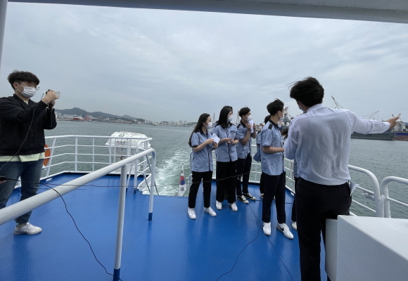 다만 현장 참여 학생은 코로나19 예방 차원에서 10명으로 제한했으며 나머지 80여명의 학생은 학교에서 온라인으로 참여했다. 교육 내용은 부산항 항만 시설, 컨테이너 화물 하역 과정, 입출항 선박 소개 등이다.