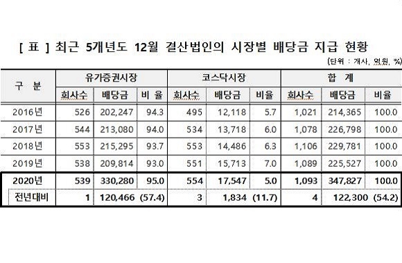 시장별로는 유가증권시장에서는 539개사가 전년대비 57.4% 늘어난 33조 280억원의 배당금을 지급했다. 또 코스닥 시장은 554개사가 전년대비 11.7% 증가한 1조 7547억원을 지급했다.