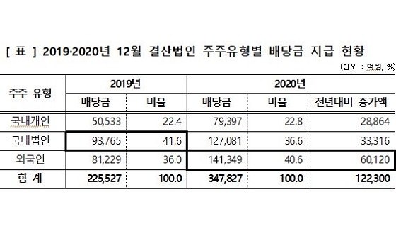 배당금 지급 대상 주주는 유형별로 외국인이 14조 1349억원을 지급받아 40.6%로 가장 높은 비율을 차지했다. 이어 국내법인 12조 7081억원(36.6%), 국내 개인 7조 9397억원(22.8%) 순으로 나타났다.