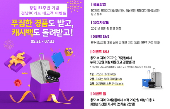 BNK경남은행은 오는 7월 31일까지 ‘창립 51주년 기념 경남BC카드 대고객 이벤트’를 진행 중이다.