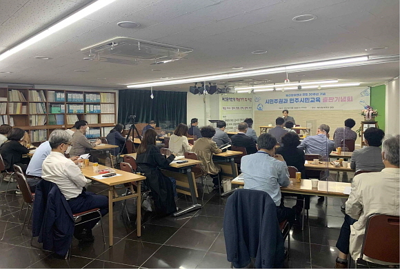 부산참여연대가 창립 30주년을 맞아 지난 26일 늦은 오후 부산참여연대 강당에서 ‘시민주권과 민주시민교육 출판기념회’를 연 가운데 부산대 진시원 교수(맨 앞)가 저서에 대해 발표하고 있다.