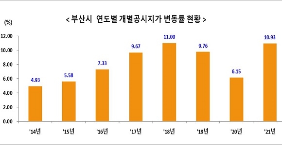 부산시가 지난 1월 1일 기준 지역 16개 구·군의 개별 토지 총 68만 9221필지에 대한 개별공시지가 조사·산정 결과를 31일 발표했다. 그 결과, 공시지가 평균 변동률이 10.93% 상승해 지난해보다 4.79%p 오른 것으로 나타났다.