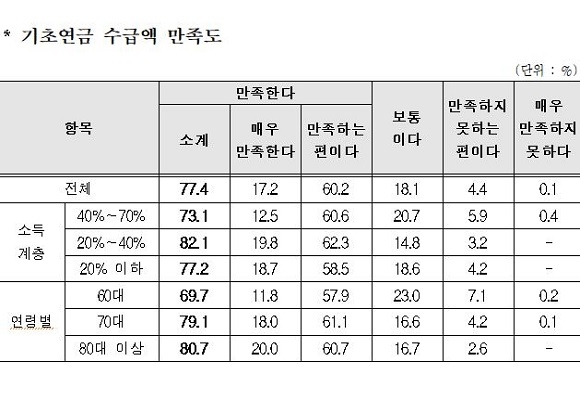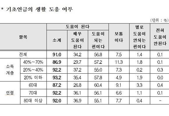 특히 지난해 월 최대 30만원으로 기초연금이 인상된 소득 하위 20~40% 수급자의 경우 ‘생활에 도움 된다’고 응답한 인원이 92.2%, 수급액에 만족한다는 인원이 82.1%를 기록했다.