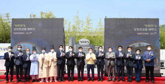 인사말 등 주요 식순 후 내외빈은 LED제막 버튼을 눌러 그동안 베일에 가려져 있던 가락국기 상징조형물을 공개했다. 국립김해박물관 앞 가야의 길 공원 외에 가야테마파크 광장에도 설치된 2기의 가락국기 상징조형물은 경남은행이 약 2억원을 들여 설치했다.