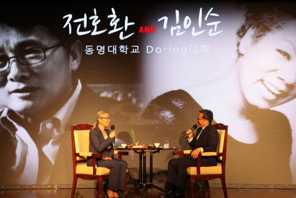 인순이(왼쪽)과 전호환 동명대학교 총장(오른쪽)이 토크쇼를 진행하고 있다. (사진=동명대 제공)