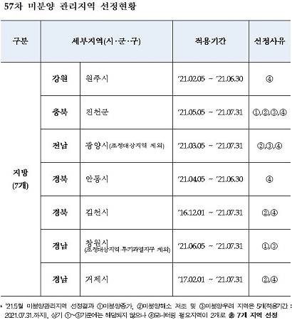 이번 57차 미분양 관리지역은 지난 56차(7개 지역)와 비교해 지정 지역 수는 같으나 경남도 창원시가 신규 편입됐으며 충남도 당진시가 해제된 것으로 확인됐다.