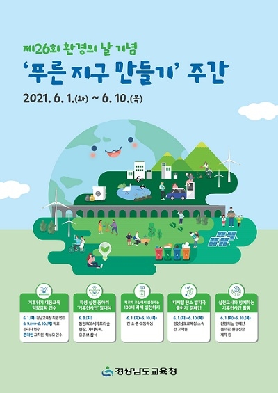 경남도교육청은 제26회 환경의 날(5일)을 기념해 1일부터 10일까지를 '푸른 지구 만들기 주간'으로 정하고, 기후행동과 친환경 실천을 위한 교육과 캠페인을 집중 전개한다고 밝혔다.