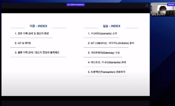 이번 특강은 위고컴퍼니 개발팀의 한상익 연구원이 맡아 ‘물류 이력 관리 및 원산지 증명’을 주제로 이론과 실습교육을 실시했다. 강연은 원격강의 솔루션인 에어밋(Airmeet)을 활용해 120분간 진행됐고, 블록에 사물인터넷(IoT) 데이터를 저장하는 방법을 학생들에게 전달했다.