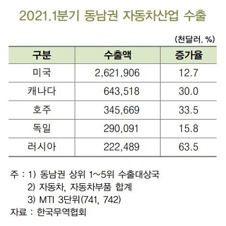 다만 반도체 부품 조달 차질, 수입차 점유율 상승세, 르노삼성차와 한국지엠 부진 등은 동남권 자동차 산업의 성장 제약 요인이라고 우려했다.
