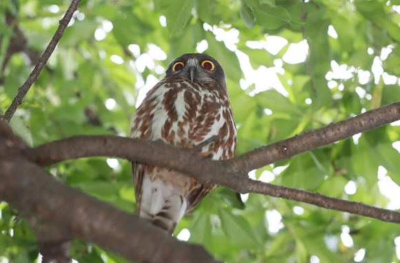 천연기념물 324호인 솔부엉이 한마리가 3일 오전 경남 함양군청 앞 나뭇가지에 앉아 휴식을 취하고 있다. (사진=함양군 제공)