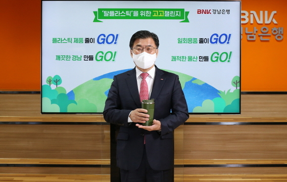 최 은행장은 BNK금융그룹 김지완 회장으로부터 다음 주자로 지목받아 캠페인에 동참하게 됐다. 플라스틱 제품 줄이고(GO)·일회용품 줄이고(GO)·깨끗한 경남 만들고(GO)·쾌적한 울산 만들고(GO) 등 실천 약속이 띄어진 LED패널 앞에서 평소 사용하는 텀블러를 들어 보이며 ‘환경 보호' 실천 의지를 전했다.