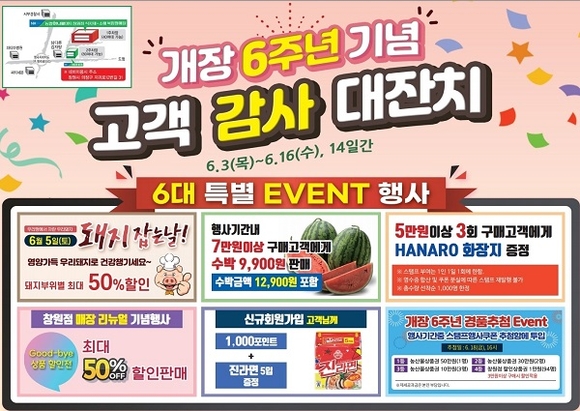 농협하나로마트 창원점은 이달 3일부터 16일까지 고객 감사 대잔치 행사를 실시한다. 이번 행사는 개장 6주년 및 매장 리뉴얼을 기념해 고객에게 다양한 혜택을 제공하고자 진행된다.
