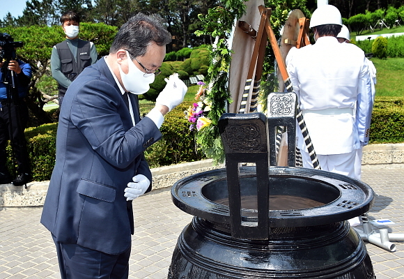 지난 6일 오전 부산 중앙공원 충혼탑에서 ‘제66회 현충일 추념식’이 열린 가운데 김석준 부산시교육감이 추념식에 참석해 헌화 분향하고 있다. (사진=부산시교육청 제공)