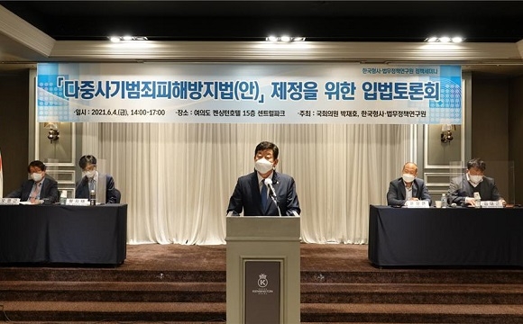 박재호 국회의원(부산 남구을, 더불어민주당)과 형사·법무정책연구원이 공동주최한 ‘다중사기범죄피해방지법 제정 위한 토론회’가 지난 4일 여의도 켄싱턴호텔 센트럴파크에서 성공적으로 마무리됐다.