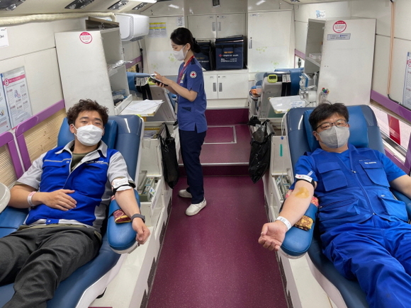 이날 공장에 마련된 이동식 헌혈 버스에서 헌혈에 참여한 임직원들은 마스크 착용, 체온 측정과 손 소독 등 감염병 예방 수칙을 지키며 헌혈 캠페인에 참여했다.