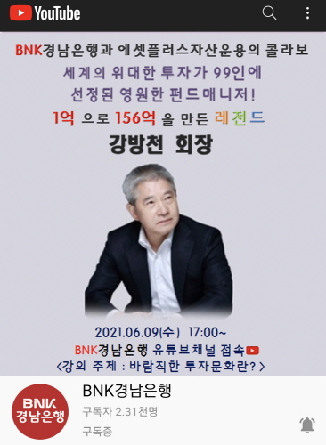 BNK경남은행은 오는 9일 공식 유튜브 채널 ‘BNK경남은행’에서 ‘강방천 회장 비대면 라이브 특강’을 진행한다.