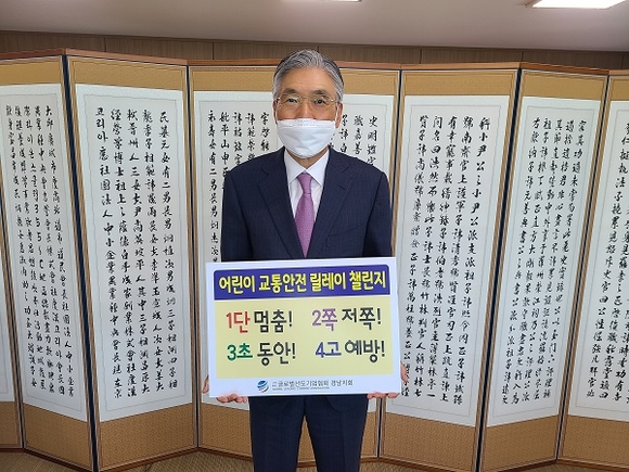 이상연 글로벌선도기업협회 경남지회장(경한코리아 회장)과 양재부 창원국가산업단지 경영자협의회장(신스윈 대표이사)이 '어린이 교통안전 릴레이 챌린지'에 동참했다.