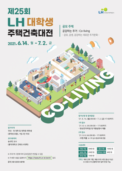 한국토지주택공사(이하 LH)는 사회 트렌드를 반영한 새로운 주거문화에 대해 대학생들의 창의적인 아이디어를 도출하고 그들의 역량 및 경력개발을 지원하기 위해 ‘제25회 LH 대학생 주택건축대전’을 개최한다고 밝혔다.
