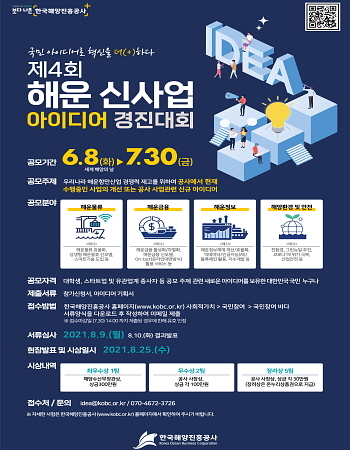 한국해양진흥공사가 내달 30일까지 전 국민을 대상으로 ‘제4회 해운신사업 아이디어 경진대회’를 진행한다고 9일 밝혔다.