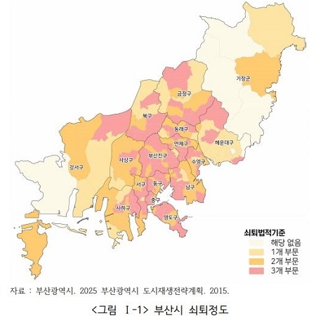 보고서에 따르면 부산의 원도심 일대는 구릉지 중심의 자연발생적 시가지 형성에 따라 대규모의 노후 불량주택이 밀집해 있는 상황이다. 이에 부산시에서 지속해서 도시재생사업을 추진했으나 공동화가 심화하고 주거지 쇠퇴가 가속화하고 있는 실정이다.