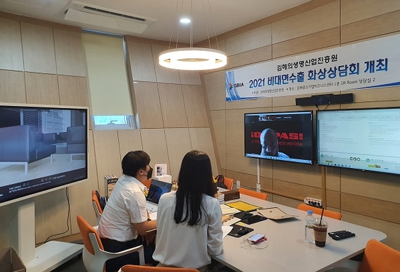 김해의생명산업진흥원은 지난 4일 김해중소기업비즈니스센터 1층 화상상담장에서 비대면 인도 수출 화상상담회를 개최했다.