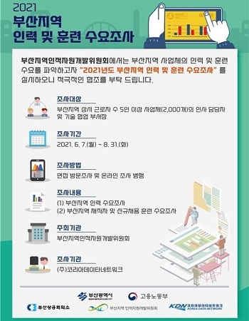 부산지역인적자원개발위원회가 지난 7일부터 오는 8월 31일까지 13주간 ‘2021년도 부산지역 인력, 훈련 수요조사’를 시행하고 있다고 9일 밝혔다.