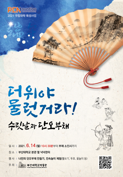 부산대학교 박물관은 우리나라 4대 명절(설·단오·추석·한식) 중 하나인 단오(음력 5월 5일)를 맞아 ‘더위야 물럿거라! 수릿날과 단오부채’ 행사를 마련했다. 올해 단오인 14일 오전 10시 30분부터 부산대 본관 옆 넉넉한터 광장에서 전통부채 만들기와 민속놀이 문화체험을 무료로 제공한다고 9일 밝혔다.