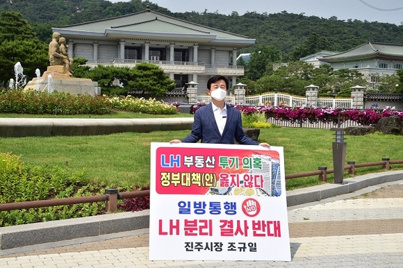 조규일 진주시장이 지난 7일 발표된 정부의 LH 혁신방안을 강력 규탄하기 위해 정부 서울청사와 국회의사당 앞에서 1인 시위를 이어가고 있는 가운데 9일에는 지역을 살리려는 시민들의 간절한 염원을 정부에 강력히 전달하기 위해 청와대 앞에서 1인 시위에 나섰다.