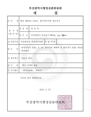 결국 지난달 27일 행정심판위에 ‘청구인(송만정)에 대한 출석정지 30일 처분을 취소한다’는 내용의 재결이 나와 어제(14일) 재결서류가 최종 통지됐다. 또한 본지 취재 결과, 부산진구의회가 마스크 특위 관련해 8명의 공무원을 고발한 건을 철회하기로 함에 따라 구청의 재의 요구서도 철회하기로 결정됐다.