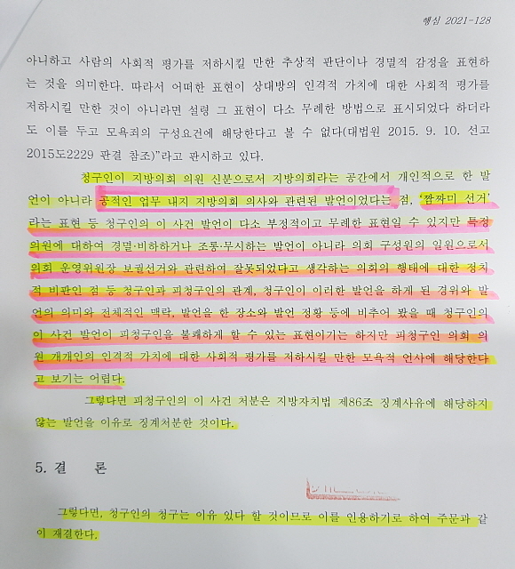 15일 당사자인 송만정 의원(더불어민주당)은 본지에 위의 집행정지에 불복해 시 행정심판위에 낸 ‘출석정지 처분 취소청구’가 지난달 27일 받아들여져 어제 최종 서류가 통지됐다고 밝혔다.