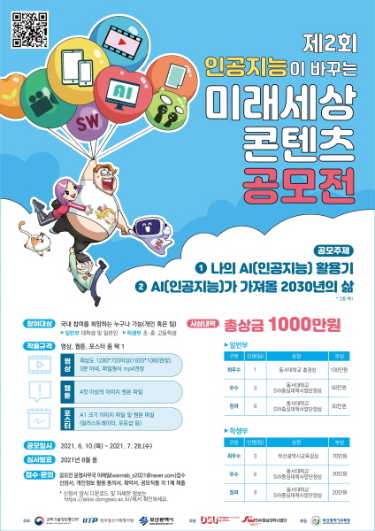 동서대학교 SW중심대학사업단은 ‘제2회 인공지능이 바꾸는 미래세상 콘텐츠 공모전’을 개최한다고 16일 밝혔다. 이번 공모전은 과학기술정보통신부, 정보통신기획평가원, 부산광역시가 주최하고 부산광역시교육청이 후원한다.