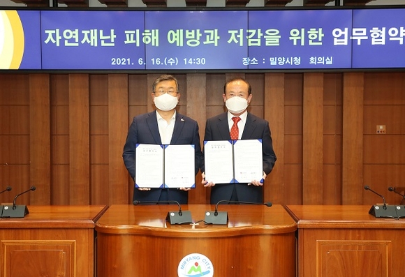 경남 밀양시는 16일 시청 소회의실에서 사단법인 한국자연재난협회와 자연재난 피해 예방과 저감을 위한 업무협약을 체결했다.