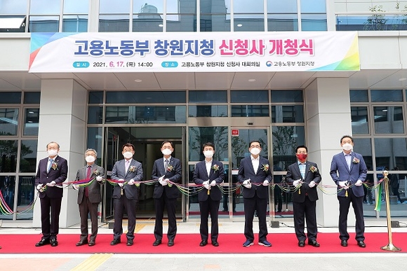 허성무 창원시장이 17일 오후 2시 고용노동부 창원지청 신청사 개청식에 참석해 박화진 고용노동부 차관, 박종원 경남도 경제부지사를 비롯한 주요 기관장과 노사 대표자 등과 함께 축하했다.