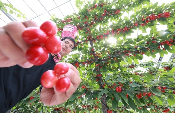 17일 경남 함양군 함양읍 가재골 체리농장에서 박대진씨가 새콤달콤한 맛을 자랑하는 여름과일 체리를 수확하고 있다. (사진=함양군 제공)