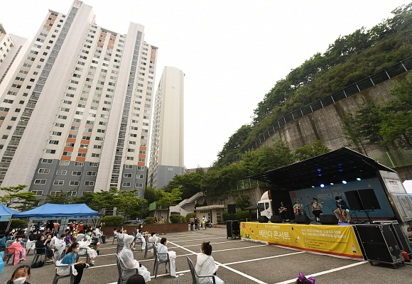 이날 공연은 당감동일스위트 아파트 주민들이 각 가정 베란다에서 관람할 수 있도록 단지 내에 배치된 4.5톤 이동형 차량에서 펼쳐졌다.