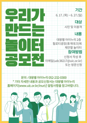 울산시설공단 대왕별 아이누리는 시민 참여 기반의 놀이공간을 조성하고 일부 공간의 이용객 집중을 해소하고자 이달 17일부터 27일까지 2층 필로티 광장 휴게데크에 조성될 놀이터의 제안 공모전을 진행한다.