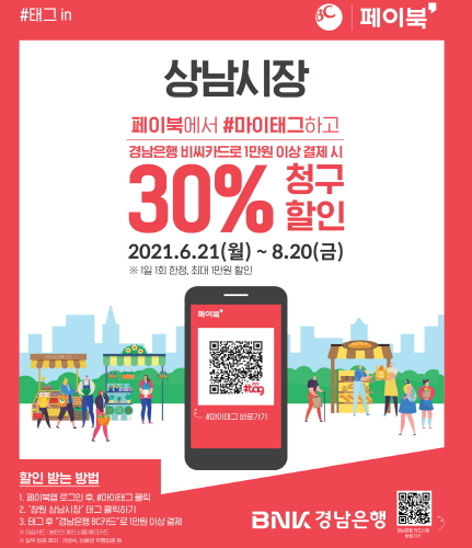페이북 또는 비씨카드 앱 ‘#마이태그 이벤트 코너’에서 ‘창원 상남시장’을 태그한 후 창원 상남시장에 입점한 가맹점에서 경남BC카드(개인 신용/체크)로 1만원 이상 결제 시 30% 청구할인 혜택을 받을 수 있다.
