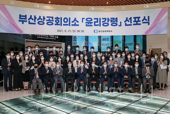 먼저 부산상의는 최근 화두로 떠오르는 ‘ESG 경영’을 도입하기 위해 21일 오전 9시 30분 ‘임직원 윤리강령 선포식’을 부산상의 1층 챔버스퀘어홀에서 열었다. 이날 전 직원이 서명한 ‘윤리강령 준수 서약서’를 낭독하고 직급별 대표 직원 6명이 장인화 회장에 서약서를 전하는 방식으로 진행됐다.