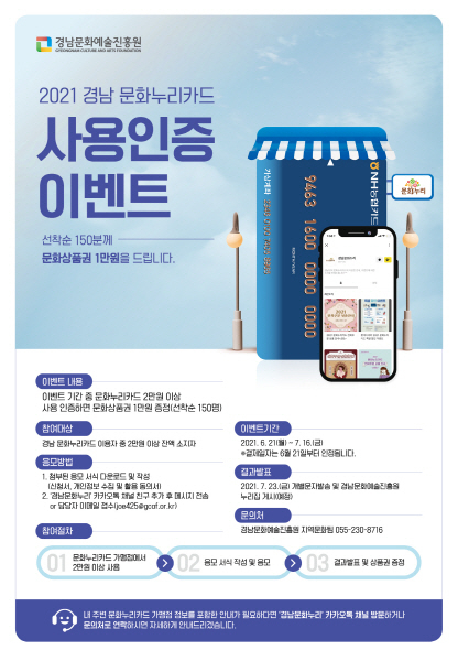 경남문화예술진흥원은 오는 7월 16일까지 선착순 150명에게 문화상품권 1만원을 증정하는 문화누리카드 사용 인증 이벤트를 진행한다.