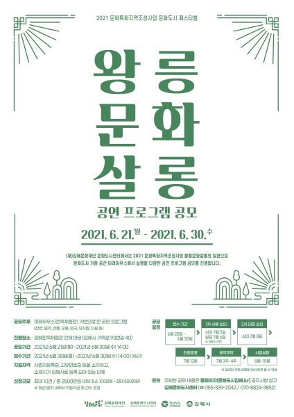 김해문화재단 문화도시센터는 2021년 문화특화지역조성사업 문화도시 페스티벌 ‘왕릉문화살롱’에 참여할 공연 프로그램을 오는 28일부터 30일까지 공모한다.