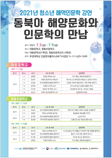 부경대 인문한국플러스(HK+)사업단은 오는 7월 2일부터 9일까지 부산 대동중학교와 청동초등학교를 직접 찾아 ‘2021년 청소년 해역인문학 강연–동북아 해양문화와 인문학의 만남’ 프로그램을 진행한다.