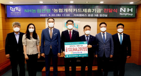 NH농협은행 경남영업본부는 22일 경상국립대학교를 찾아 ‘NH농협은행 개척카드기금’ 1억 3394만원을 전달했다고 밝혔다.